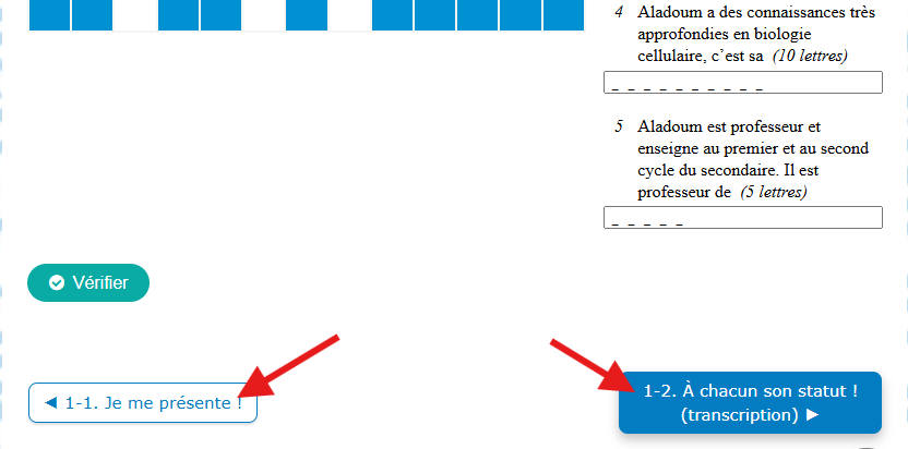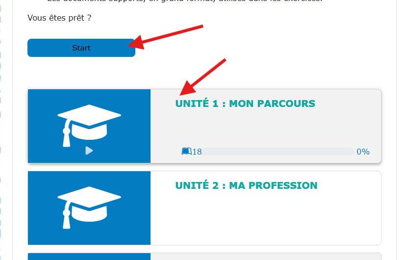 Pour naviguer d'une activité à l'autre il faut entrer dans une unité (en cliquant sur une carte unité ou sur le bouton start), puis vous trouverez des boutons tout en bas permettant d'accéder à l'activité suivante ou précédente.